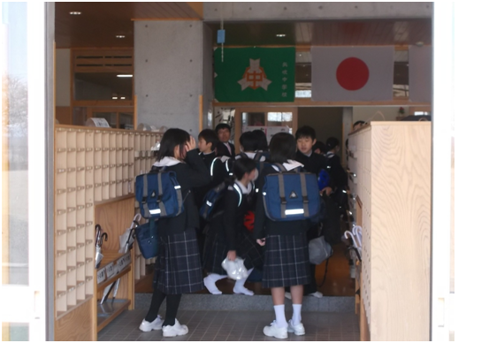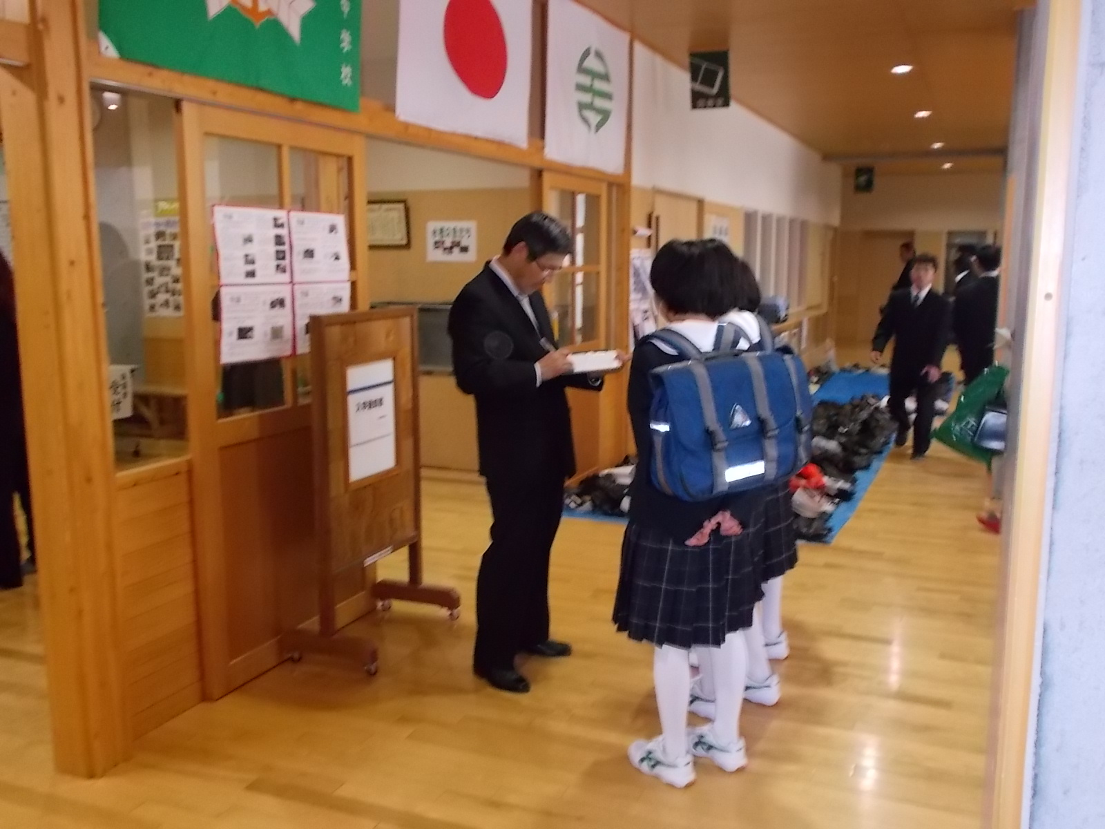 (真新しい制服とカバンでの登校です) (昇降口で出席の確認をしています)