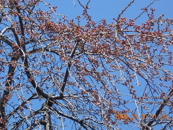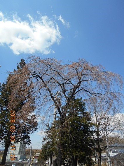 2018年3月30日 11時35分校舎西側にある、しだれ桜の芽が膨らんで、赤くなってました。