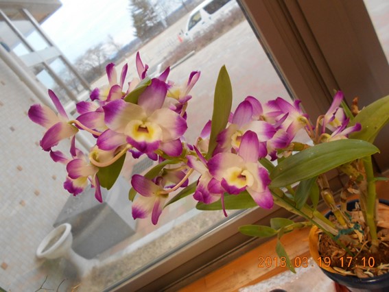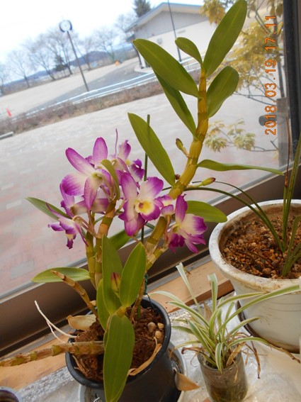 2018年3月19日 17時15分ラウンジにあるランの花が土日の間に咲き誇りました。