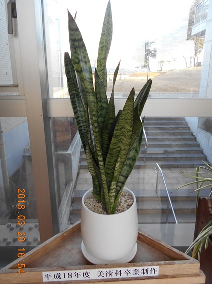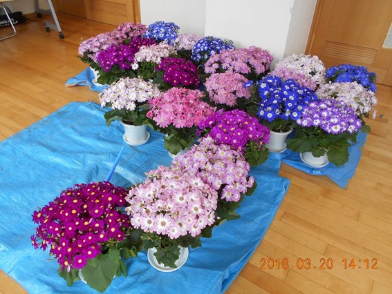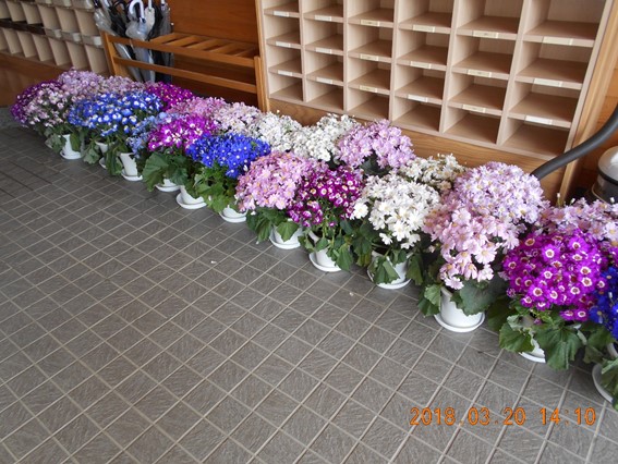 2018年3月20日 14時18分3年生の昇降口と、体育館のミーティングルームに植木鉢が沢山並んでいます。