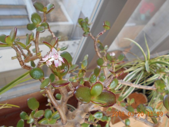 2018年3月20日 16時06分校長室横の廊下に金のなる木があります。今頃になってやっと咲きました。