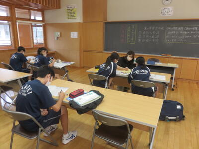 2022年7月21日 18時13分今日から楽しい夏休みですが、受験生である3年生にとっては、夏休みは受験勉強の頑張り時でもあります。本校の3年生の中には、夏休み中、学校に来て勉強を頑張りたいという生徒もいて、早速今日から学習会に参加しています。そんな3年生をサポートティーチャーとして真壁淳子先生が勉強を教えてくださっています。頑張れ3年生!