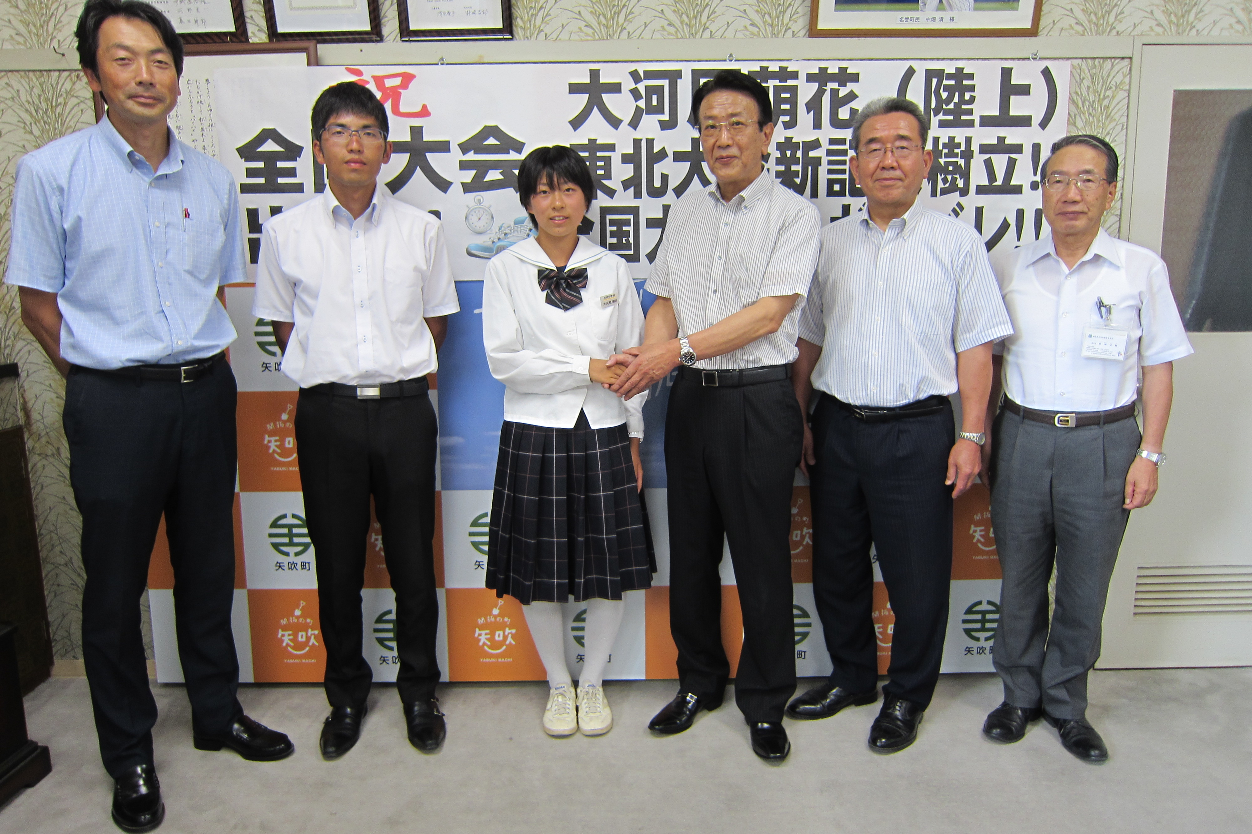 2018年8月10日 17時34分本日、大河原萌花さんが矢吹町役場で中学生全国大会出場報告会に参加しました。8月7~9日に岩手県北上市で行われた東北大会において新記録で優勝し、全国大会にはずみをつけました。顧問の前田先生から県大会からの成績を報告し、野崎町長から熱い激励をいただきました。8月17~22日まで岡山市で全国大会が開催されます。大河原さんへの応援のほどをよろしくお願いいたします。