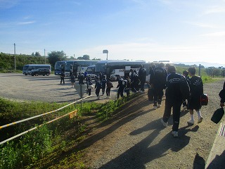 出発式の様子とその後のミーティング中の様子、バスへ乗り込む様子を撮りました。