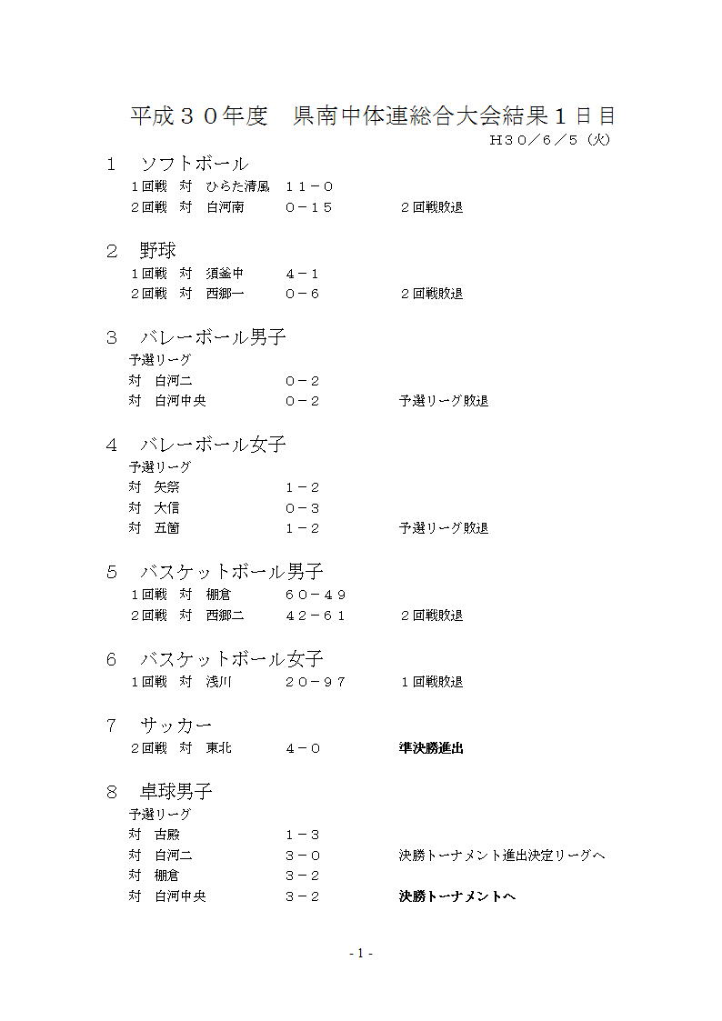 2018年6月7日 11時06分県南総合大会1日目結果速報。