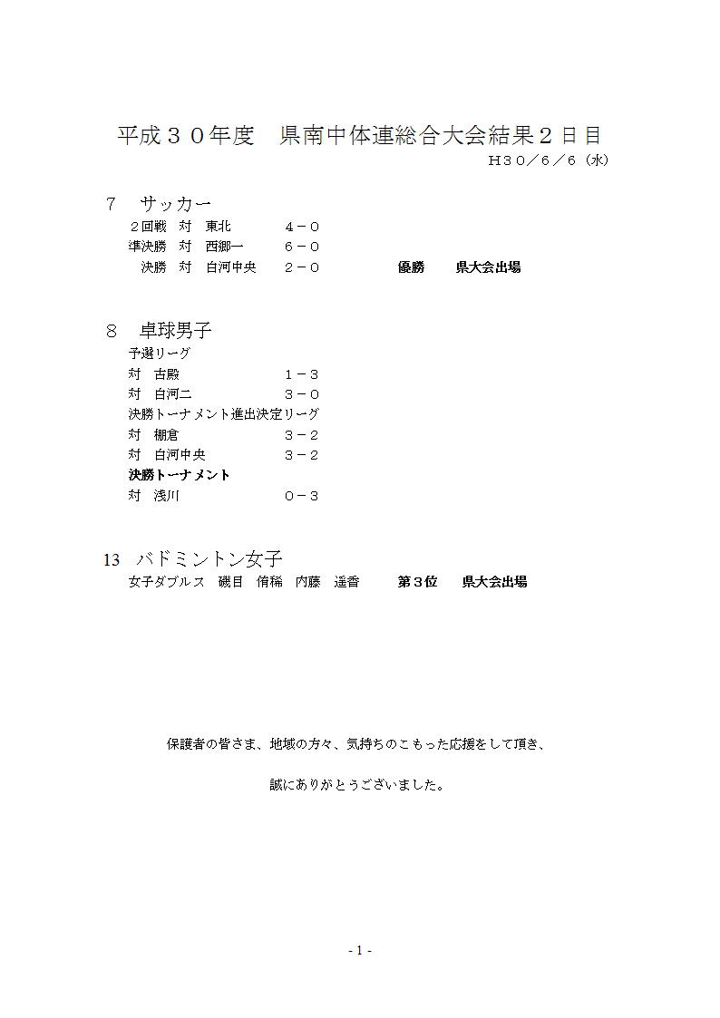 平成30年度県南中体連総合大会2日目の結果について