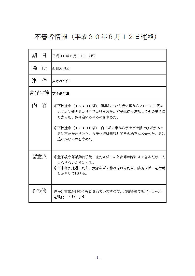 不審者情報があり、学級で生徒たちに注意を促しました。