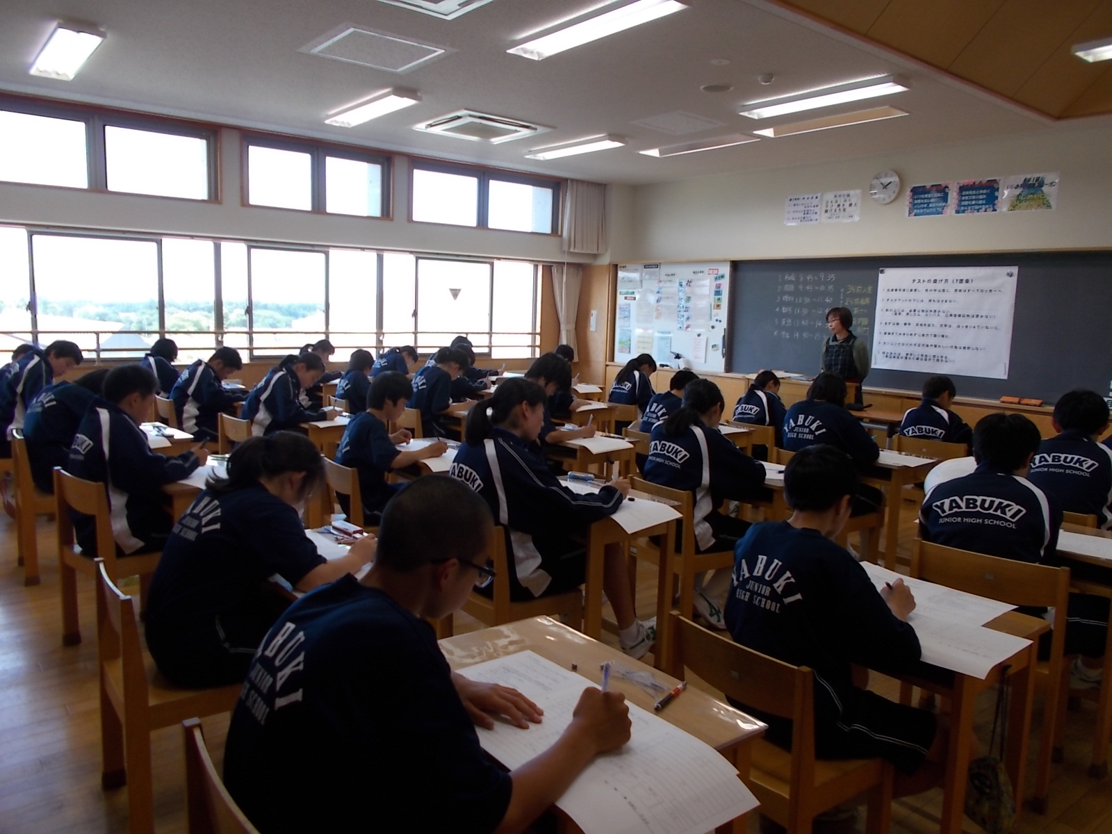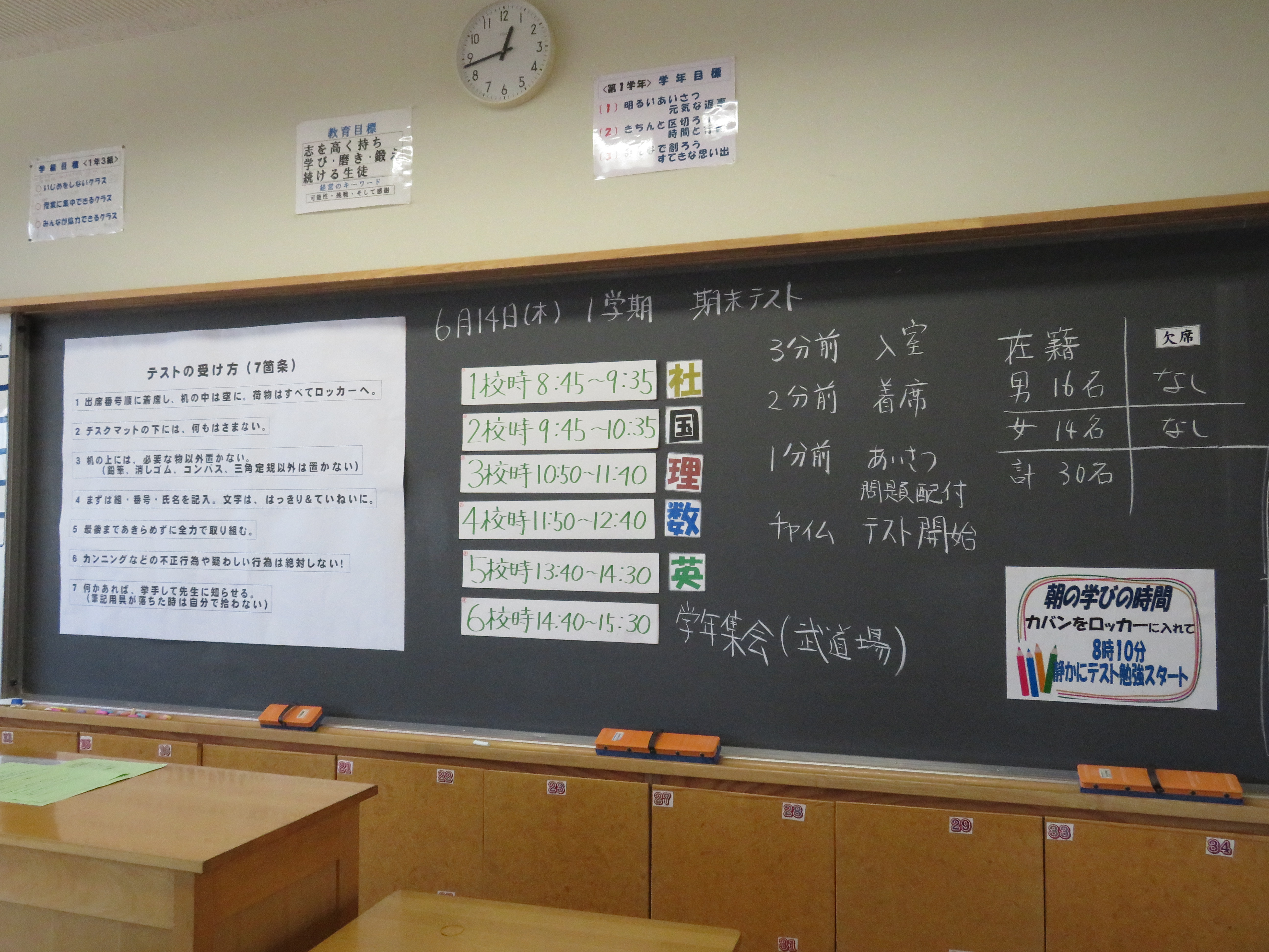 1年生の教室黒板です。テストに関する注意事項もあります。