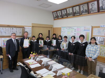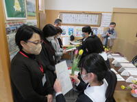 2023年3月15日 15時44分3月15日(水)は、今年度最後のボランティア読み聞かせ活動となりました。今年度は11回お世話になりました。いつも5名のボランティアの方々にお越しいただくのですが、今日はご都合により4名の方々の参加でしたので、放送委員長がピンチヒッターで1クラス分読み聞かせ役を務めました。終了後、8時20分から校長室で感謝の会を実施しました。生徒を代表して図書委員長がお礼の言葉を述べ、花束を贈りました。また、来年もお願いします!