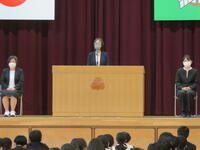 2023年4月12日 14時28分4月10日(月)5・6校時に生徒会主催の対面式を実施しました。1年生に対して、2・3年生の先輩が、学校行事や生徒会行事、生徒会委員会活動、部活動などについて説明をしました。ビデオを活用したり、部活動紹介では実演をしたり、様々な工夫を凝らしながら、紹介や説明を行いました。1年生にとっては、中学校生活のイメージを具体的にできる機会となりました。