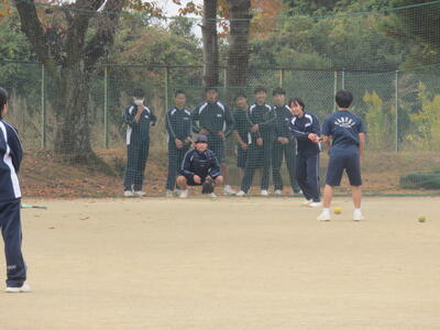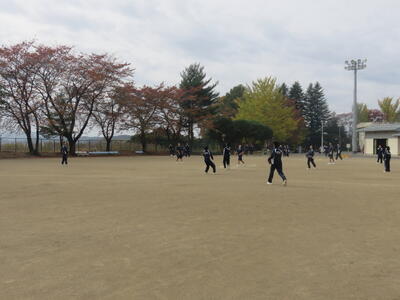 2022年11月1日 12時05分3年生の保健体育では、現在、校庭でソフトボールを実施しています。和気藹々と楽しそうに取り組んでいます。校庭の隅では、銀杏の葉が黄色くなって秋の深まりを感じさせています。