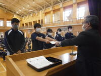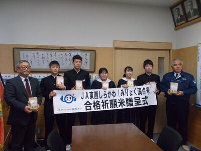 2022年11月21日 16時57分本日21日(月)にJA東西しらかわから代表理事組合長の薄葉 功様、矢吹中央支店統括支店長の井戸沼謙一様他3名の職員の方々が来校され、本校3年生に「合格祈願満点米」を贈呈していただきました。このお米は、JA東西しらかわのブランド米「みりょく満点米」で、棚倉町の山本不動尊で合格を祈願していただいたものです。生徒一人につき1㎏いただきました。今回の贈呈式では、各学級の学級委員長に代表して参加し、生徒を代表して吉田紳之介君(3-1)がお礼の言葉を述べました。3年生一人一人には24日(木)に配布し、持ち帰ってもらう予定です。ぜひご家庭でもこのことを話題にしていただき、ブランド米を味わってください。そして、3年生全員それぞれが受験先に合格を果たしてほしいと願っています。