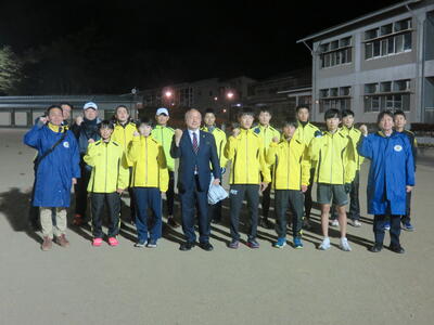 2022年11月19日 12時33分11月18日(金)午後7時から矢吹中学校校庭で「第34回ふくしま駅伝矢吹町チームの激励会」が行われました。蛭田町長様、小松副町長様、大杉教育長様から激励のお言葉をいただいた後、角田チーム監督様や溝井キャプテン様から健闘を誓うあいさつ・お礼の言葉がありました。また、最後に中学校校庭を練習場所として使用させていただいたということで、選手全員で丁寧なお礼の言葉もいただきました。20日(日)の本番でのご健闘をお祈りします。