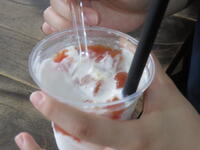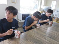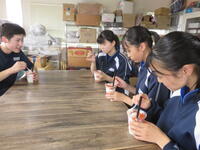 写真撮影の後、いよいよ試食です。実は、今回お邪魔した6人の生徒のうち男子3人がトマトが苦手・・・。でも食べてみたら「トマトじゃないみたい」「美味しい」とみんな笑顔に。私も「確かにトマトだ!」と「でもトマトがスイーツになれっこない!!」の2つの考えが行ったり来たりで味覚とトマトの味の既成概念が混乱し、これまで味わったことのないような動揺と感動の渦の中で頭の中が真っ白に・・・。慌てて食べ始めてしまったシェイクの姿を写真に撮る始末。