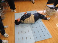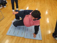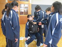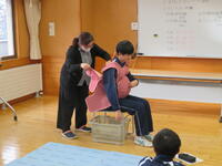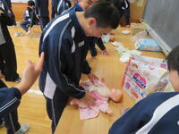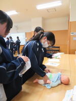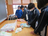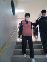 2023年12月8日 11時55分3年生は、6日(水)に家庭科の授業として、「妊婦体験学習」を実施しました。妊婦体験用ジャケットを身に付けて歩いてみたり、腰掛けてみたり、寝転んでから起き上がってみたり、靴下を脱いだりはいたりしてみたり、階段を上り下りしたり、また、乳児の人形を使っておむつの交換をしたりしてみました。自分が、産み育てられた苦労を味わい、想像しながら学びました。ご家庭でも3年生の体験を話題にしてみてください。