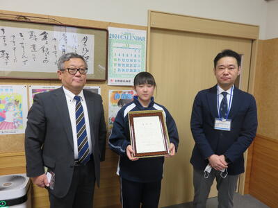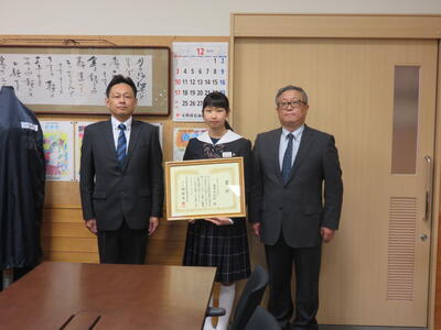 2023年12月18日 16時37分本日、今年度の「第42回全国就学生人権作文コンテスト福島県大会」において奨励賞を受賞した野田栞菜さん(1年)の表彰式を行いました。表彰式には、矢吹町人権擁護委員の小針啓幸様が来校され、賞状を授与してくださいました。2・3年生からも多くの応募がある中、1年生ながら受賞して立派でした。おめでとうございます。