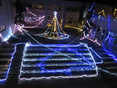 2023年12月22日 16時52分今週18日(月)に、矢吹中学校の冬の風物詩であるイルミネーション点灯式を行いました。本校では、校舎中庭に、12月から2月までの間、電飾のイルミネーションを点灯させることがここ数年の恒例となっており、11月28日(火)に3年生全員が参加して思い思いに楽しそうに電球を飾ってくれました。冬の間、暗くなってからの時間帯は、きれいな電飾の飾り付けが、私たちの心を温めてくれます。