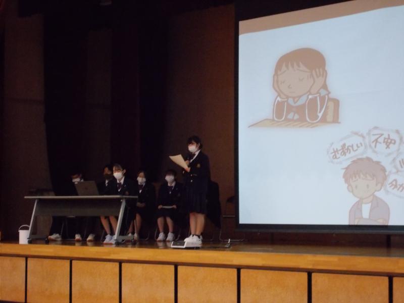 テーマは「年齢を重ねた時に、私たちの体にどのような変化が起こるか」です。育ち盛りの中学1年生にとっては「高齢化」や「老化」などは、言葉として知っていてもなかなかイメージがつきにくいものです。先輩たちが高校で学んでいることや福祉体験を通して得た経験を、スライドや劇をまじえて紹介いただきました。