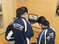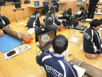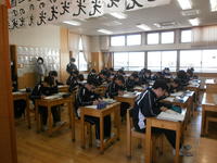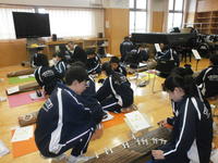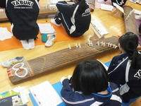 2020年1月9日 14時59分3学期始業式から2日目、今日は1年生の音楽の授業研究会でした。授業内容は、和楽器「箏」です。お正月のTVで良く流れていた箏の音、その再現ですのでタイムリーな授業でした。箏の演奏技術はなかなか難しいようで、ビデオを用いて学習していました。どの班にもパソコンが脇にあり、いつでも演奏ビデオを見れるような工夫があり素晴らしく感じました。「初段」の奏法で、右手の「かき爪」「割り爪」、左手の「引き色」「後押し」など見よう見まねで演奏や音色を楽しんでいました。