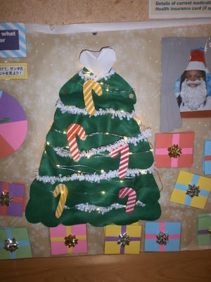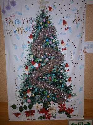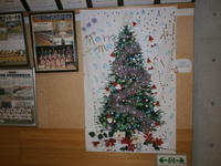 2019年12月6日 14時37分事務室の外廊下の壁に、クリスマスツリーが御目見しました。あゆり学級の生徒達が家庭科の時間に、遠藤先生の協力を得ながら、楽しんで作った物だそうです。学校内に季節感のあるものが見えると心が和みますね。とても良くできたクリスマスツリーでした。