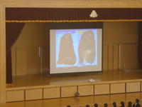 講演では、タバコを吸っていない肺と吸っている肺の比較の写真などスクリーンに映しながら、