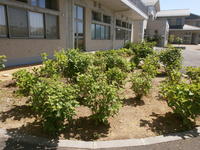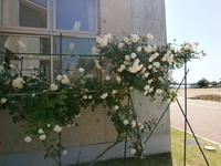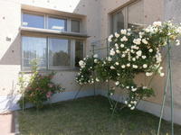 2019年5月30日 09時17分昨年、伸び放題であった枝を綺麗に剪定されたバラが今、美しく咲いています。赤いバラではなく、真っ白なバラが空の青さとコントラストをなしているので、一層美しく映えています。また、すぐそばには薄ピンク色の花が咲く木があり、これも白とのコントラストをなしています。花は、人の心を和ませてくれるという話は本当ですね。環境作りに励みたいと思います。アジサイの花芽も大きくなってきました。6月が楽しみです。