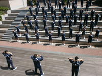 2019年5月30日 13時26分明日は、来週に迫った県南総合体育大会の激励会の日です。その激励会に向けて、今日のお昼休みの時間に、最後の応援練習が中庭で行われました。一つ一つの動作にきりっとした態度が見られ、とても立派です。何よりも練習に練習を重ねる姿に感心しました。明日の力強い応援、期待しています。