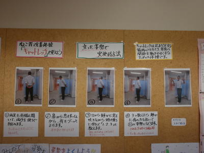 2018年12月19日 12時39分保健室の前の廊下に、「ねご背改善体操」の写真付き説明が掲示されていました。