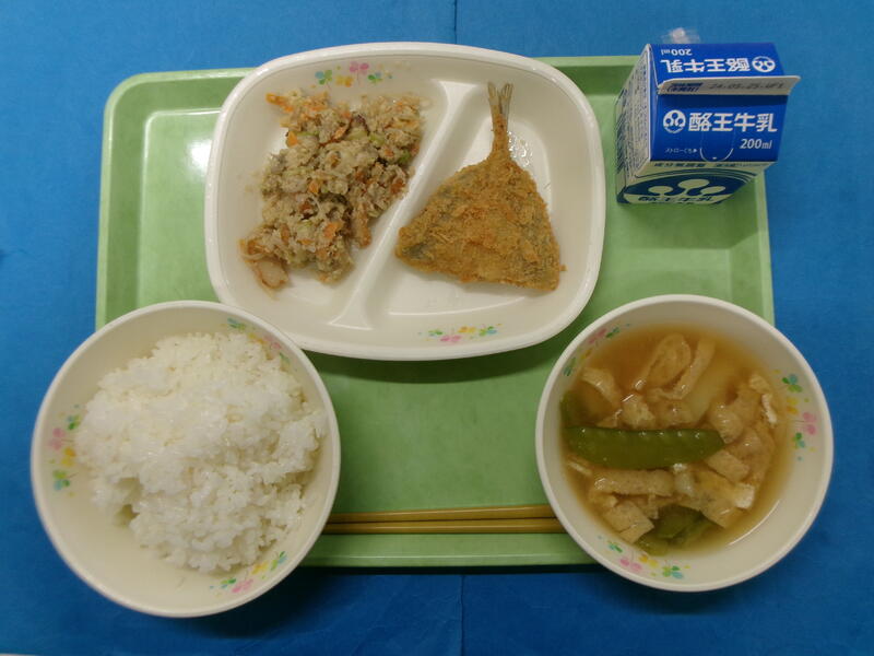 ごはん 牛乳 アジフライ うのはないり 絹さやのみそ汁
