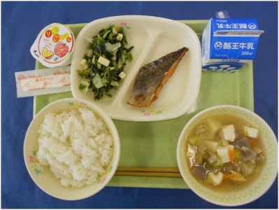 3年6組考案 2017年9月7日 12時08分 ごはん 牛乳 サケの塩焼き ほうれん草のチーズあえ 豚汁 りんごゼリー今日の献立は、3年6組の給食委員が考えた献立です。テーマは「バランスがとれる給食」です。じっくりと考えた献立です。