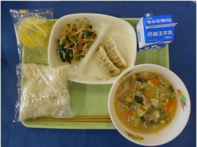 みそラーメン 牛乳 ギョウザ もやしのラー油あえ パイン