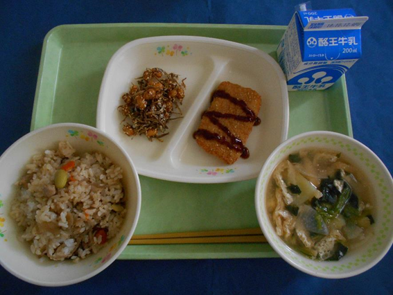 今日は3年2組の給食委員が考えた献立です。テーマは、「骨や歯を丈夫にする献立」です。たんぱく質を多く含む鶏肉や油揚げ、大豆、カルシウムを多く含んでいる小魚を取り入れた献立になっています。