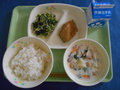 ごはん 牛乳 さわらのつけ焼き もやしの香味和え 白花豆とほうれん草のクリーム煮