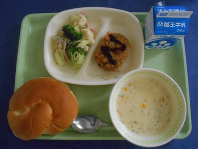 丸パン コーンポタージュ 豆とかぼちゃのコロッケ ブロッコリーサラダ 牛乳