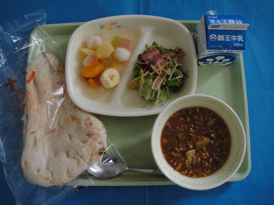 ナン キーマカレー ガーリックサラダ フルーツポンチ 牛乳