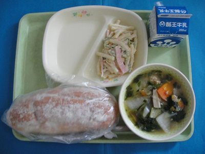今日の汁物は、給食室手作りの川俣シャモ入り肉だんごが入っています。冷たいお肉(約17kg)をねぎなどとこねて、肉だんごをひとつひとつ作ってくださいました。川俣シャモのうまみ、調理員さんの愛情たっぷり手作りの肉だんごを味わっていただいて欲しいと思います。