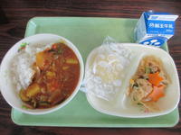 今日の給食は七夕行事献立でした。「牛乳」「麦ごはん」「夏野菜のカレー」「レンコンのサラダ」「冷凍パイン」野菜いっぱいのヘルシーメニューを、みんな美味しいともりもり食べていました。