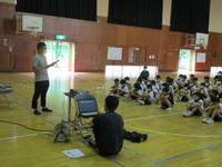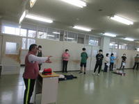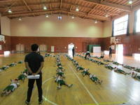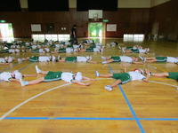 消防署から練習用のダミーとAEDを借りてきて行いました。始めに、全体で救助や連絡の仕方を確認しました。次に、AEDの使い方を各学年のチームに分かれて練習しました。「発見して確認して対応する人」「119通報(救急車依頼)する人」「AEDを持ってくる人」に役割分担、さらに交代して胸骨圧迫の仕方やAEDの使用の仕方を学びました。 毎年1年に1回は行って、どんな時でも慌てずに確実にできるようにするには確認と練習が必要です。