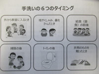 手洗いの6つのタイミングが文部科学省の通知の「学校の新しい生活様式」で呼びかけられています。「外から教室に入るとき」「咳やくしゃみ、鼻をかんだとき」「給食(昼食)の前後」「清掃の後」「トイレの後」「共有のものを触ったとき(遊具や教材・教具など)」