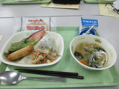 5年生の子ども達が楽しみにしていたバイキング給食が始まりました。今日の1回目は5年1組が行いました。メニューは主食が「おにぎり」「セルフサンドイッチ」主菜が「えびフライ」「チキンナゲット」「春巻」「オムレツ」「ハンバーグ」「焼き鮭」副菜が「ごぼうサラダ」汁ものが「あさりと野菜のスープ」デザートが「いちご」「オレンジ」「バナナ」「クレープ」そして牛乳でした。(自分で選んで食べて、おかわりができます。)