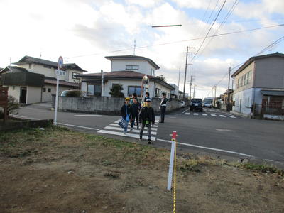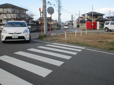 五叉路付近の横断と通行が安全にできるようになってきました。これまでボクシングジムのあった場所が整備され、横断歩道を渡ってからせまい路側帯を通らずにそのまま進むことができます。役場・教育委員会の方々が地面を固めてトラロープを張って通路を確保してくださいました。五叉路付近の全体の見通しもよくなりました。今後は小針医院前の交差点付近のように整備される予定です。