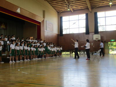 今日の全校集会では音楽会で全校生が歌う「HEIWAの鐘」の合唱練習を行いました。