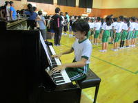 1・2・3年生は元気いっぱいリズムにのって楽しく歌い、4・5・6年生は歌詞に思いを込めて力強く歌い上げています。伴奏は6年生の小椋千紗子さんが担当しています。