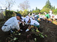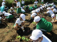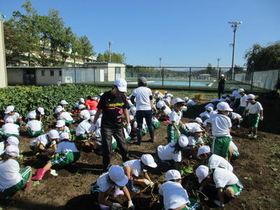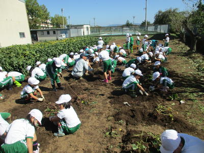 本日、1・2年生が5月末に学校の畑で苗を植えて育てていたサツマイモの収穫作業を行いました。 用務員の佐久間さんが、よく世話をしてくださったのと今年の晴続きの天候がサツマイモの生育に合っていたので大豊作となりました。一人でがんばったり、二人で協力をして掘り起こしていきますが、大きく育ったサツマイモがなかなか抜けませんでした。音楽会で披露する「おおきなカブ」のようでしたが子ども達は本当に楽しそうで笑顔がいっぱいでした。