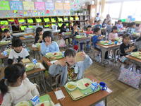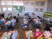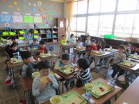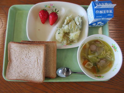 1年生 今日はパンの給食でした。メニューは黒糖食パン、マカロニスープ、ジャーマンポテト、いちごでした。「パンはどうですか?」と聞いたところ「おいしいでーす」の笑顔が返ってきました。野菜いっぱいのメニューとビタミンたっぷりの甘いいちごは健康を考えたものです。今日は天気がよく校庭で元気に遊んだので食欲がもりもりとわき牛乳もがんばって飲んでいました。学校の周りのソメイヨシノは満開で校庭のベニシダレ桜も花が咲き始めました。