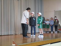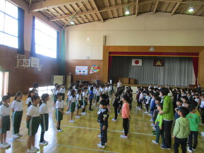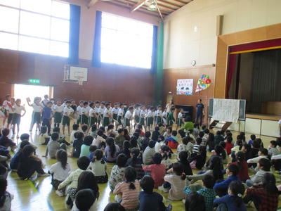 今日の昼休みの全校集会は4・5・6年生が眼科検診のため1・2・3年だけで行いました。あいさつも活動の進行や説明も3年生やりました。活動の内容は運動会に向けての「校歌」と「応援歌」の練習でした。始めは緊張していた3年生もだんだん慣れてきて、とても頼もしく感じました。元気いっぱいの歌声が体育館に響き渡りました。