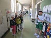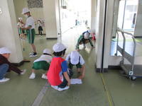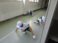 今日から1年生の清掃が始まりました。縦割り班の清掃に初めて参加するのです。6年生の班長さんが教室まで1年生を迎えに行きました。最初は用具の使い方や清掃の順序や方法を学びました。バケツの水を使って雑巾を絞るのが難しそうでしたが上級生に教えてもらうと上手になってきました。雑巾を使っての床の水拭きは一人一人が力を入れてすき間なく拭くようにがんばっていて大変すばらしかったです。