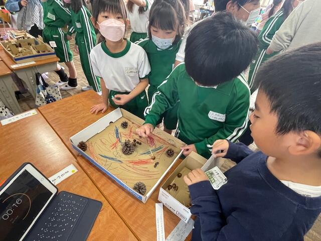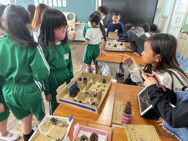 1年生が秋のおもちゃまつりに2年生を招待しました。各ブースに分かれ、自作のおもちゃで楽しく遊びました。遊び方やゲームのルールなど、1年生のもてなしは立派でした。みんなで楽しく交流しました。
