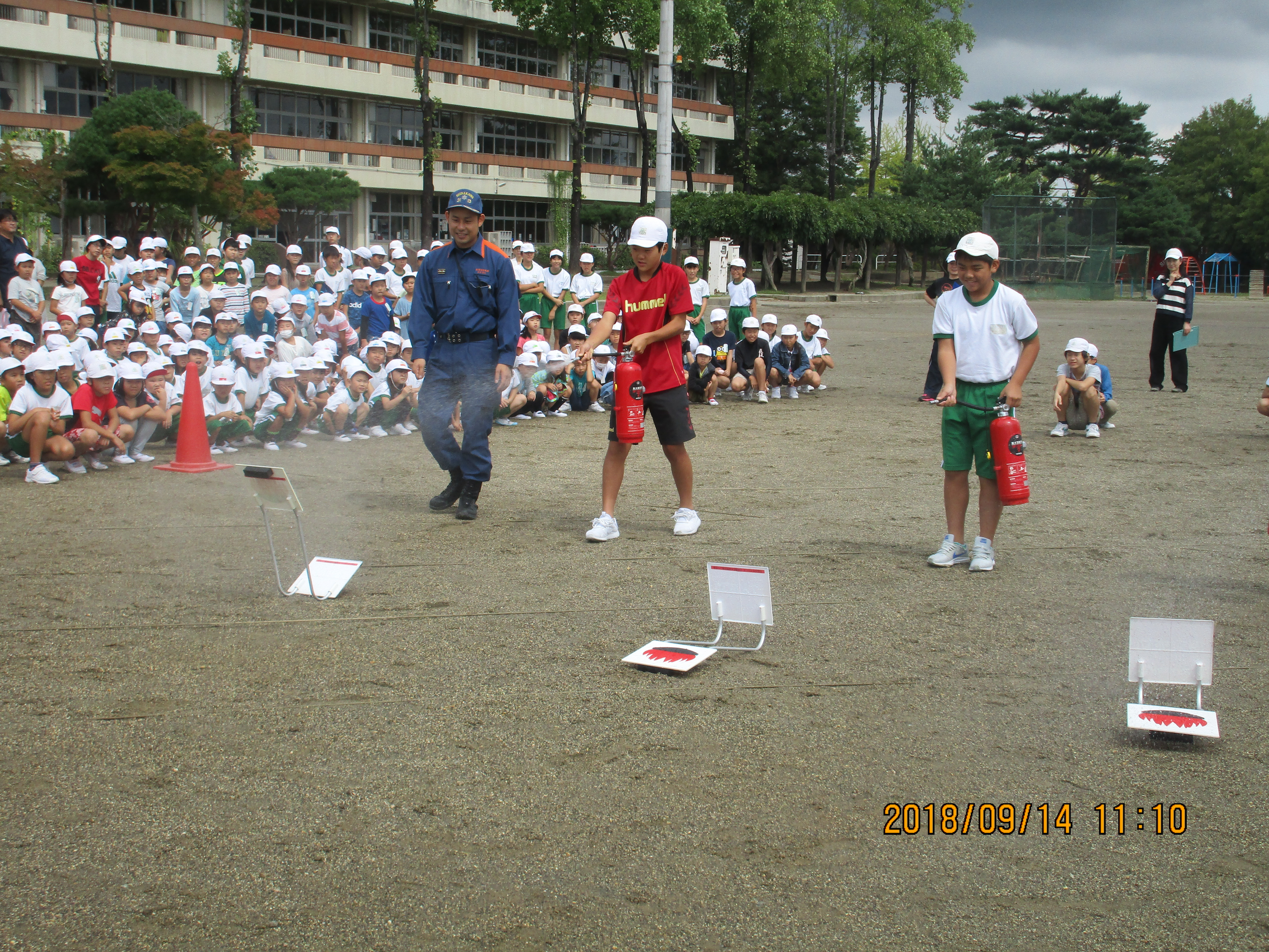 6年生による消火器を使った消火訓練も行いました。大きな声で「火事だ!」と回りに伝えた後で消火器を手順通りに使って水をかけることができました。