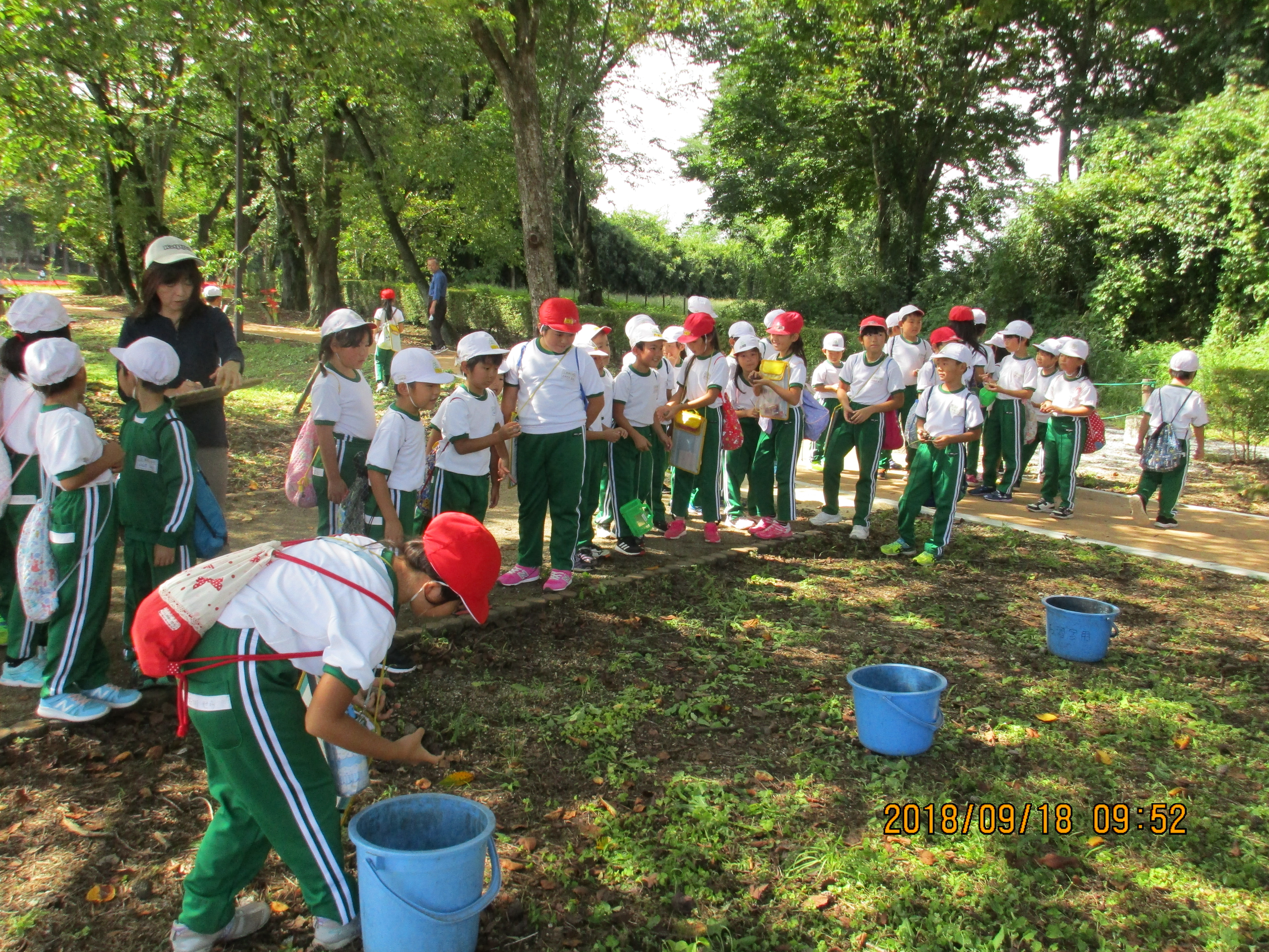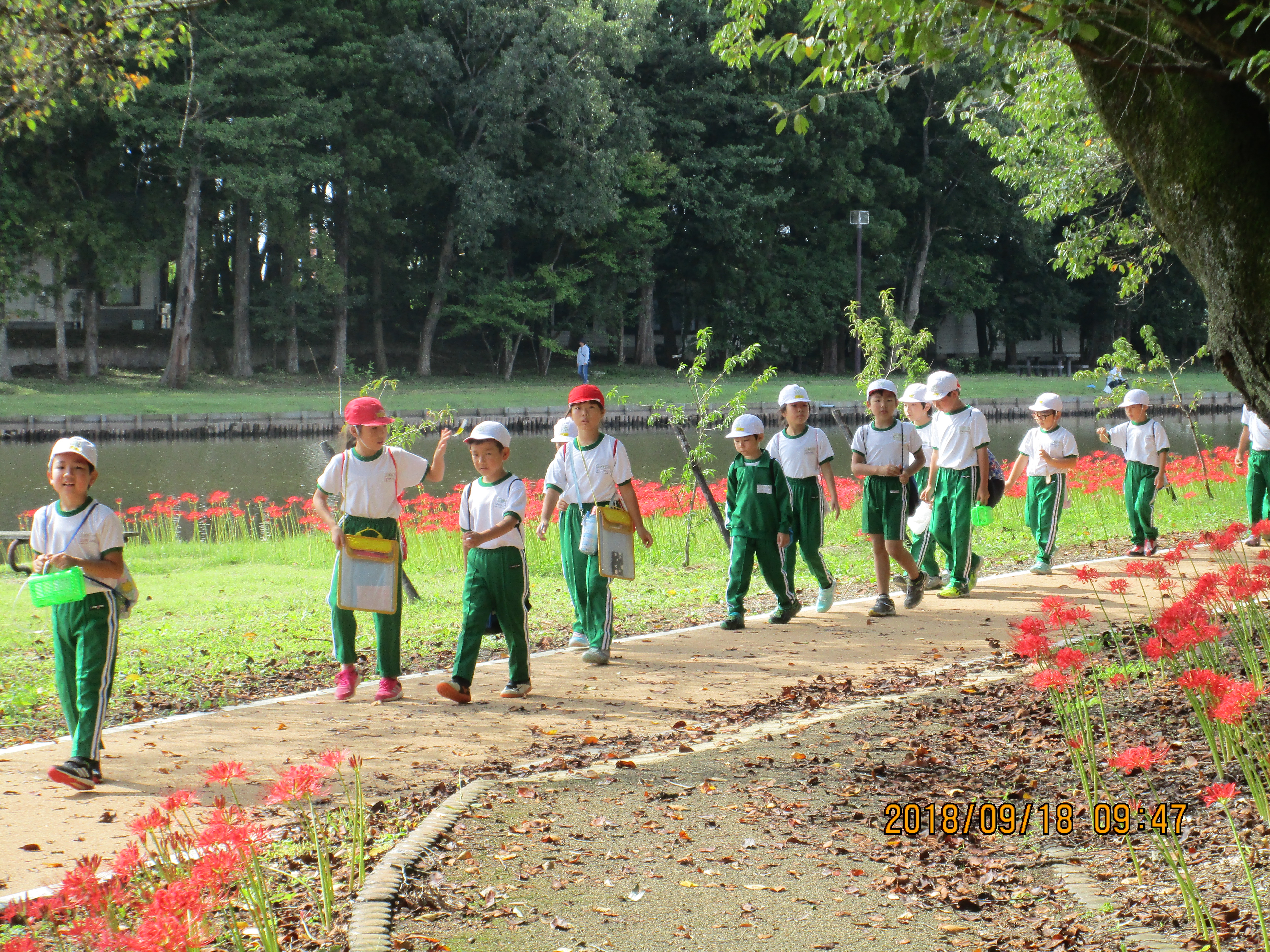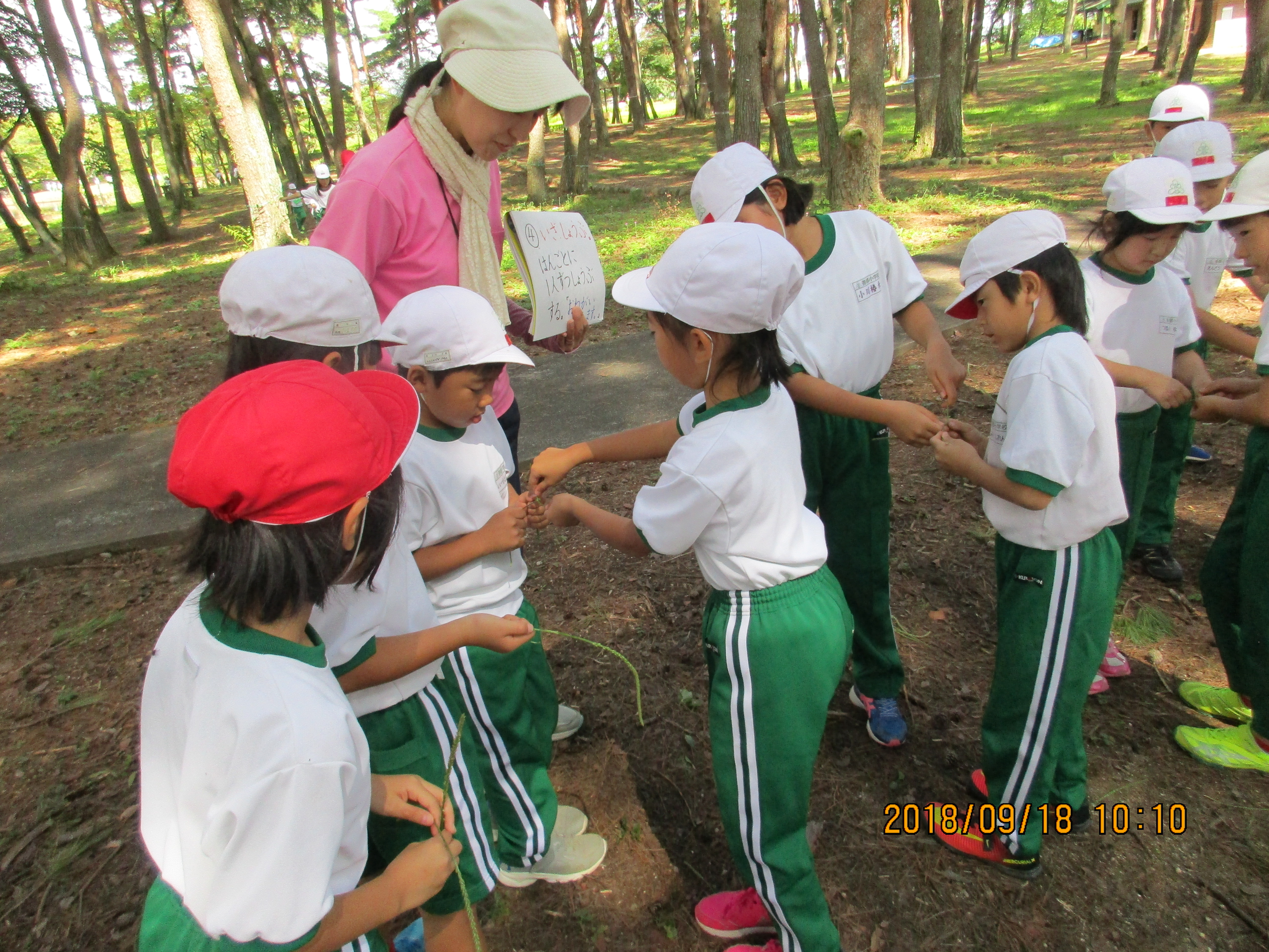 清々しい秋晴れの昨日、大池公園で1年生、2年生、3年生が自然教室を行いました。 3年生が班長さんになって34班になって活動しました。活動はオリエンテーリングで各コーナーを回りました。「まつぼっくりホールインワン」「山リレー」「オオバコずもう」「あんごうをさがせ」「ぼっくりゲット」の5つのコーナーと「生き物・草花ビンゴ」の6つの活動がありました。自然に親しみながら異学年の子どもたちが協力して楽く活動することができました。